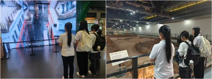 体验式实践教学第一站来到了南越王博物院。学员们参观了南越国重要考古遗存,在历史的遗迹中深刻地感受秦汉时期岭南地区的历史文化。在数字展厅,数字技术的光影演绎再现了王宫的原貌,教师们在现场讲述南越国发展的历史以及其与中央的关系等来丰富学生的历史认知,给学员们带来了极大的震撼。