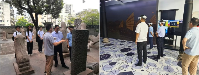 体验式实践教学第二站来到了五仙古观。越秀区文物博物管理中心主任柯林海给来访师生上了一堂生动的思政课,他把五仙观修缮和复建的历史以及为什么五仙观是羊城文化的一个重要源头娓娓道来。在数字体验场馆,通过VR技术深度还远了“海上丝绸之路”中广州的全貌,师生们戴上VR眼镜,身临其境地感受了丝绸之路贸易中广州繁忙的港口、熙攘的商贸街等场景。
